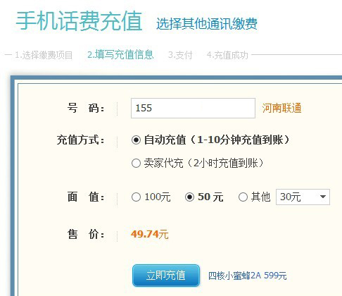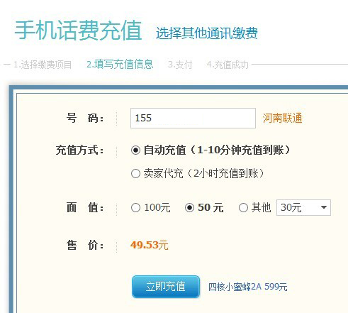 這張圖上顯示,充值50元,需要花費49.53元,然后,我再100元、50元、其他這3項中,多切換選擇幾次,就出現這下面的情況: