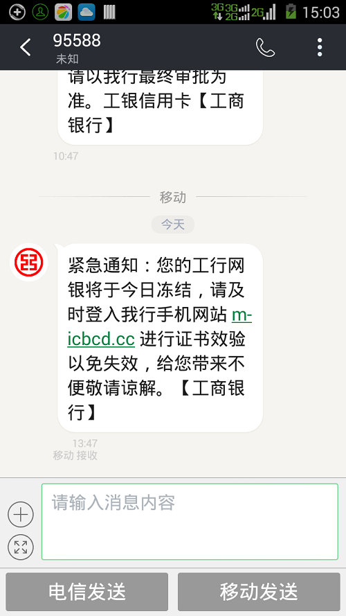 今天,騙子們用工商銀行的特服號,95588給我發了一條手機病毒短信,上面的網址,一看就不是工商銀行的。如下圖: