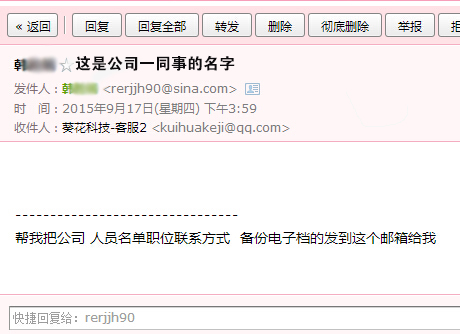 最新新收到一封電子郵件,一看是公司一同事發來的,就打開看了下,發現是索要公司的通訊錄備份的。而仔細看了下發件人的郵件地址,確不是同事的常用郵件地址。看來又是一個騙子,冒充的公司同事,想騙取公司的通訊錄。