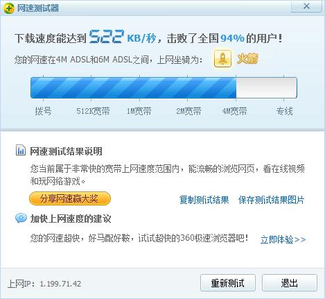 才4M的帶寬,360居然說我的網(wǎng)速是“火箭”級的,真是頭暈。我的幾個(gè)朋友,他們用的都是10M的寬帶,比我的強(qiáng)多了。