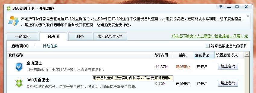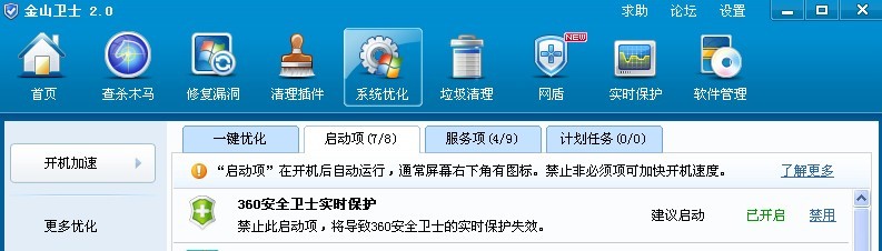 我在自己的電腦上,同時安裝了360安全衛士和金山衛士,然后都運行優化功能,發現以下結果: