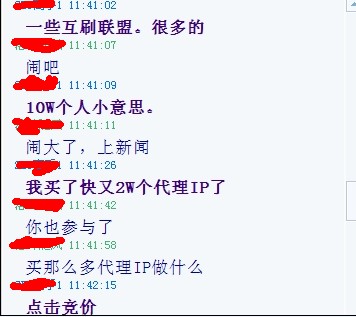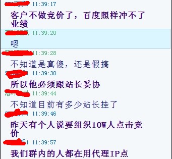 ![]() 圖片中的對(duì)話不是PS的,的確是真實(shí)的,百度官方聲稱“在我們的評(píng)估中,本次升級(jí)將會(huì)影響5%的搜索流量,此措施已經(jīng)生效”,我們?cè)诟鞔笳搲琎Q群,站長網(wǎng)都會(huì)看到這樣的信息,5%的搜索量,已經(jīng)讓很多站長趴倒在地了,站起來需要很長時(shí)間。 隨著時(shí)間的推長,惡意點(diǎn)擊百度競(jìng)價(jià)的站長也越來越多,目前已經(jīng)有人組成10w的站長參與此事,不惜成本和代價(jià)來引起百度的重視,下圖是今天早上和一位站長的聊天記錄。